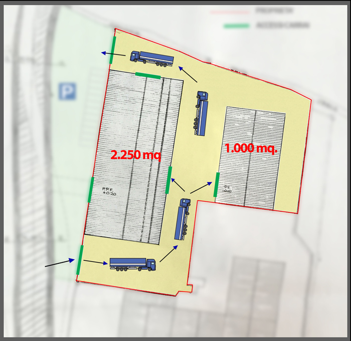 - Il doppio ingresso carraio che permette ad un TIR l'ingresso e l'uscita senza fare manovre.